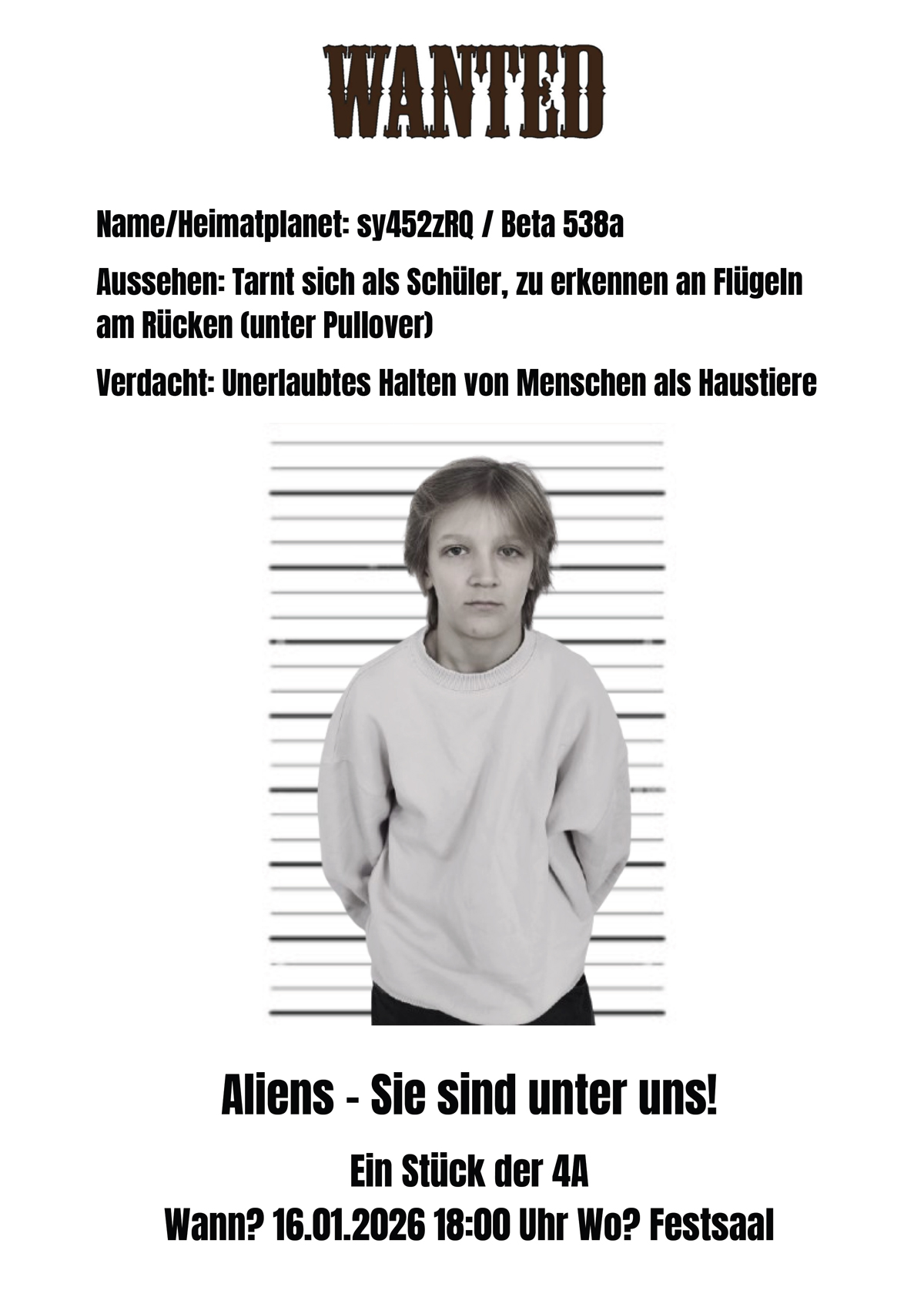 Diese und viele andere Fragen werden am 16.01. um 18.00 im Festsaal im selbst entwickelten Theaterstück der 4A beantwortet, manche Fragen werden allerdings offen bleiben. Kommt selbst und seht und staunt!