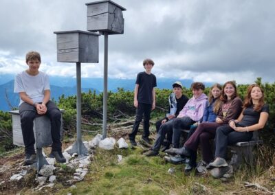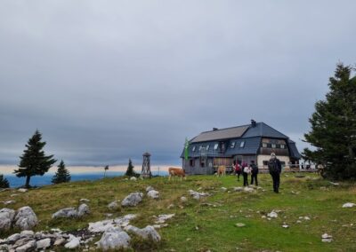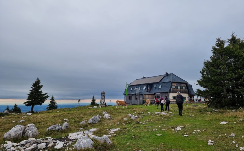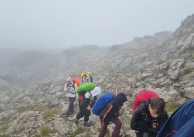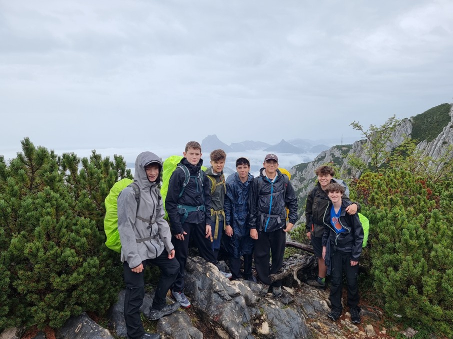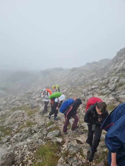 Angekommen am Berg machten sie sich auf den Weg. Wind kam auf, doch vorerst war er erträglich. Der erste Gipfel erfolgreich erklommen und die Anwesenheit in einem Buch vermerkt. Die Klasse freute sich sehr, doch der immer stärker werdende Regen trübte die Freude ein wenig. Vor ihnen lag noch ein knapp dreistündiger Weg bis zur ersten Hütte, also machten sich schnell weiter auf die Reise. Jedoch erschwerten die nassen Wurzeln und Steine die Route.